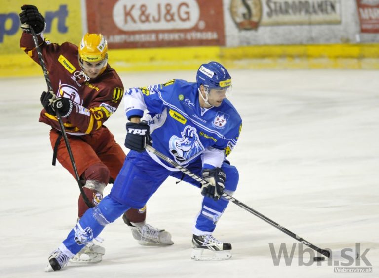 Arne Kroták (v popredí) z HK Poprad počas 31. kola hokejovej Tipsport extraligy medzi Dukla Trenčín a HK Poprad. Trenčín, 7. december 2014. Foto: SITA/Tomáš Somr