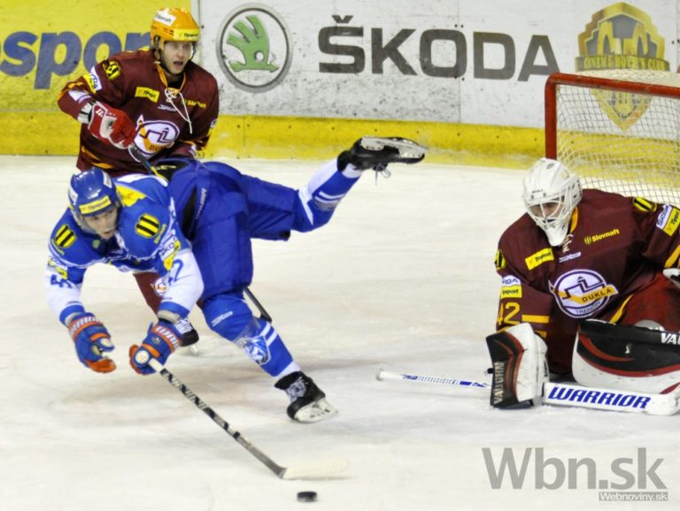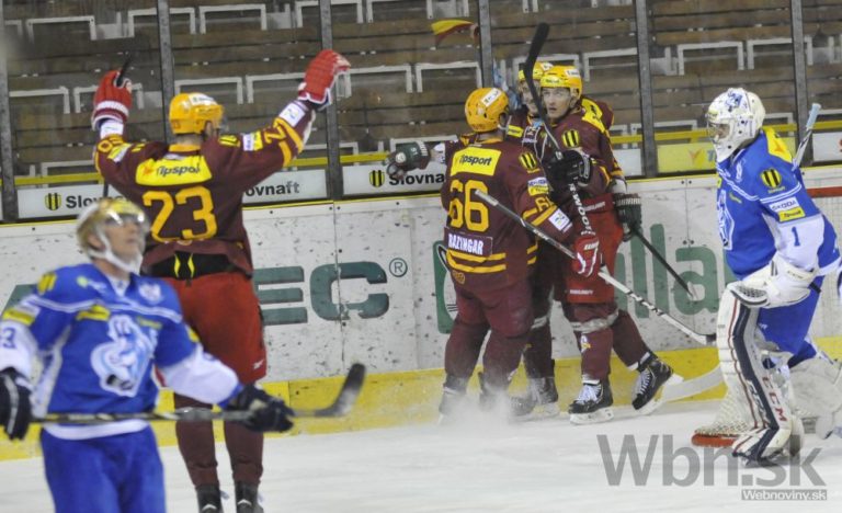 Hráči Dukly Trenčín sa radujú z gólu počas 31. kola hokejovej Tipsport extraligy medzi Dukla Trenčín a HK Poprad. Trenčín, 7. december 2014. Foto: SITA/Tomáš Somr