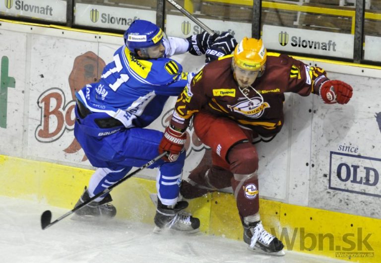 Zľava: Tomáš Bokroš z Dukly Trenčín a Lukáš Paukovček z HK Poprad počas 31. kola hokejovej Tipsport extraligy medzi Dukla Trenčín a HK Poprad. Trenčín, 7. december 2014. Foto: SITA/Tomáš Somr