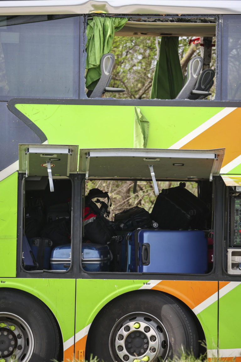 Batožina cestujúcich, ktorí boli účastníkmi nehody, sa stále nachádza v autobuse na mieste nehody na diaľnici A9 pri nemeckom meste Schkeuditz v stredu 27. marca 2024. Foto: Jan Woitas/dpa via AP