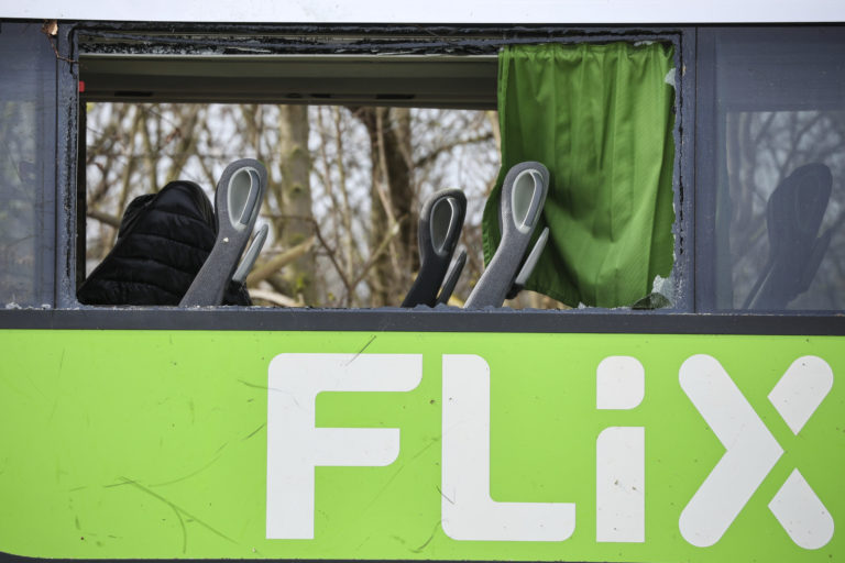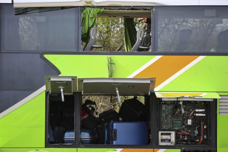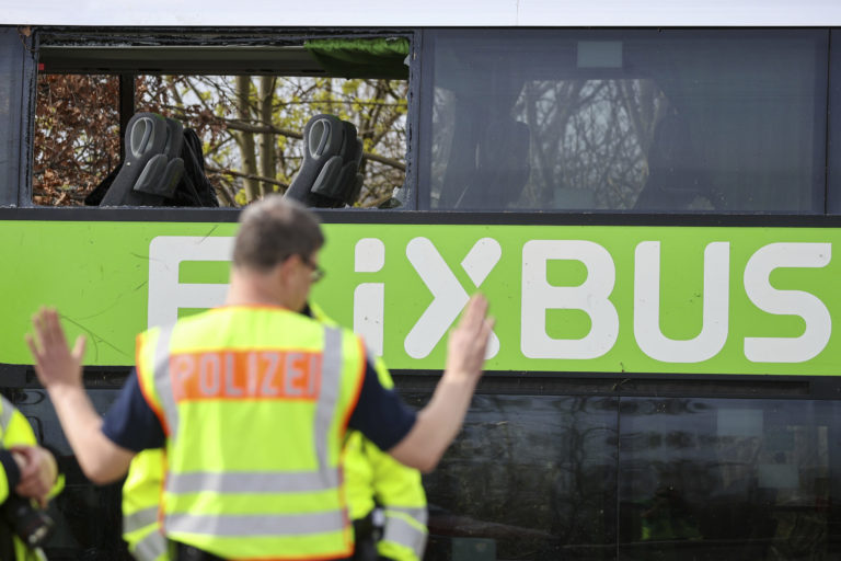 Pohľad na autobus na mieste nehody na diaľnici A9 pri Schkeuditzi v Nemecku v stredu 27. marca 2024. Foto: Jan Woitas/dpa via AP