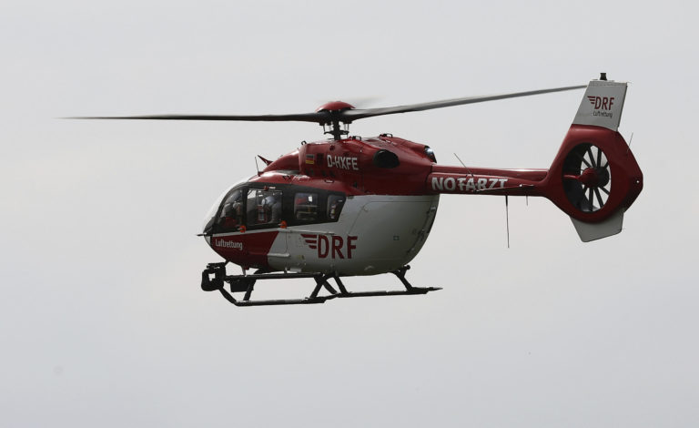 Záchranársky vrtuľník nemeckej leteckej záchrannej služby (DRF) je v akcii nad miestom nehody na diaľnici A9 pri Schkeuditzi v Nemecku v stredu 27. marca 2024. Foto: Jan Woitas/dpa via AP