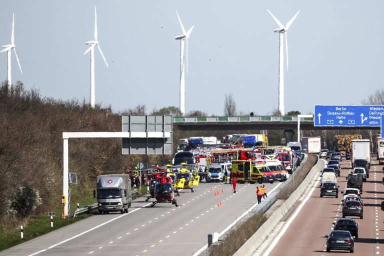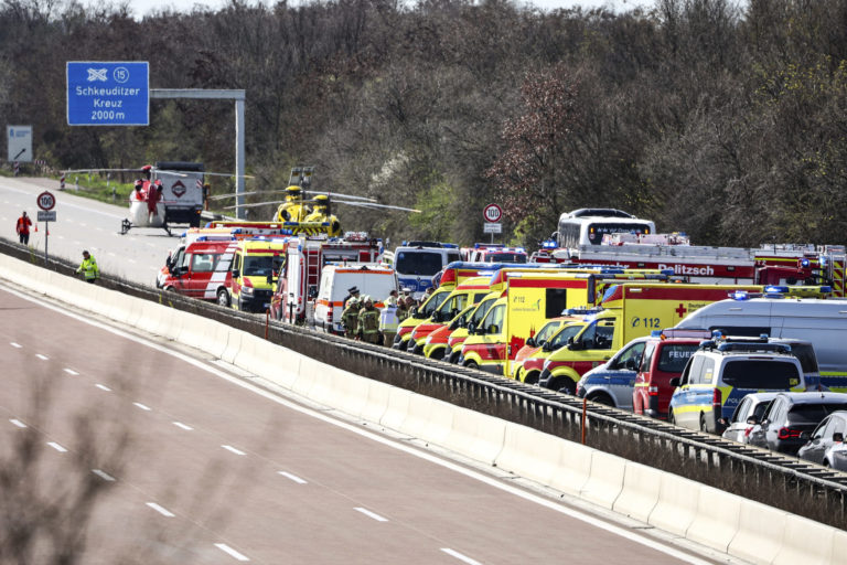 Záchranné vozidlá a záchranné vrtuľníky sú na mieste nehody na diaľnici A9 pri nemeckom Schkeuditzi v stredu 27. marca 2024. Foto: Jan Woitas/dpa via AP