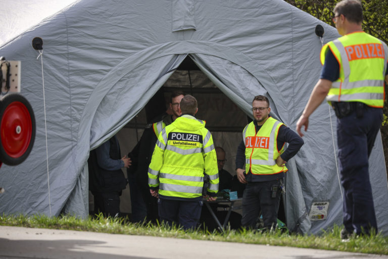 Policajti stoja pri stane na mieste nehody na diaľnici A9 pri nemeckom meste Schkeuditz v stredu 27. marca 2024. Foto: Jan Woitas/dpa via AP