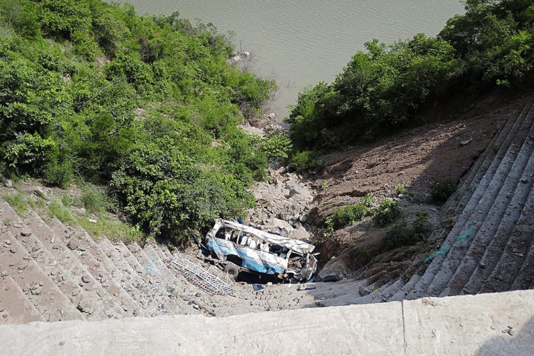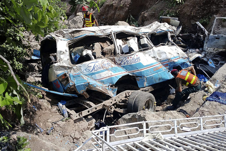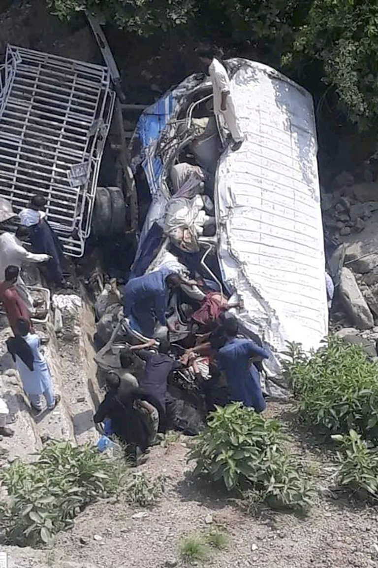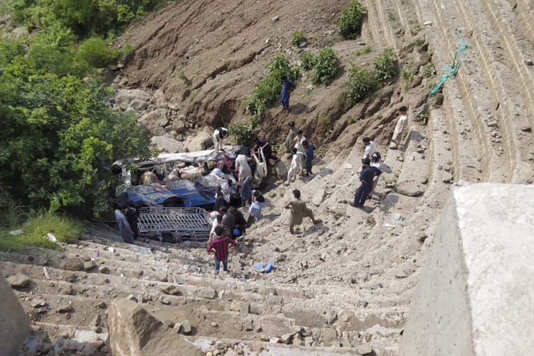 Vrak autobusu po páde do rokliny neďaleko Kahuty v Pakistane, nedeľa 25. augusta 2024. Foto: SITA/AP