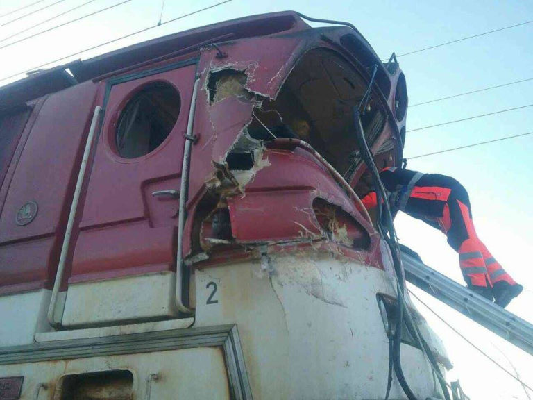 Rušeň osobného vlaku, ktorý sa zrazil s nákladným autom na trase Senec – Sládkovičovo. Zrážka sa stala okolo 8:30 pri obci Nový Svet v okrese Senec na železničnom priecestí s funkčnou svetelnou signalizáciou. Rušňovodič osobného vlaku nehodu neprežil. Bratislava, 19. december 2017. Foto: SITA/Diana Černáková