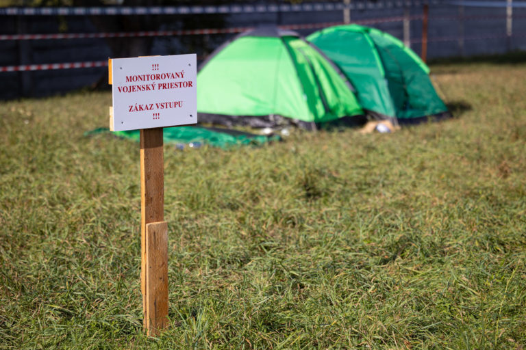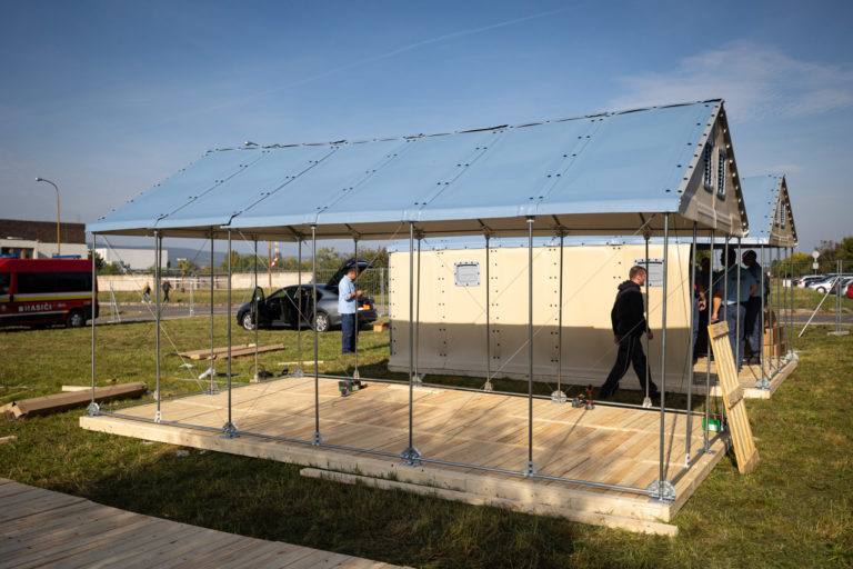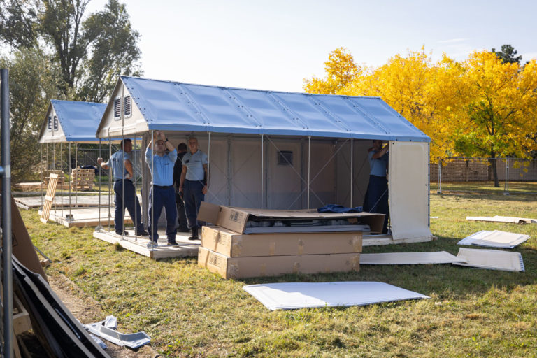 Stavanie provizórnych domčekov pre nelegálnych migrantov pri cudzineckej polícii v Bratislave počas mimoriadnej situácie, vyhlásenej od 7. októbra 2023 magistrátom mesta, z dôvodu zvýšeného počtu nelegálnych migrantov. Bratislava, 11. október 2023. Foto: SITA/Jana Birošová
