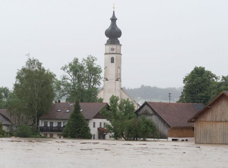 Ulice mnohých miest a obcí sú zaplavené až do výšky jedného metra. Cestu k viacerým domom voda celkom zahatala a ich obyvateľov museli zo striech zachraňovať vrtuľníkmi. Bavorské úrady odhadujú, že doposiaľ spôsobené škody by mohli presiahnuť až desať miliónov eur. Rozsah a rýchlosť povodní tam mnohých obyvateľov zaskočila; miestne úrady teraz varujú pred hroziacou katastrofou. Foto: Armin Weigel/dpa via AP