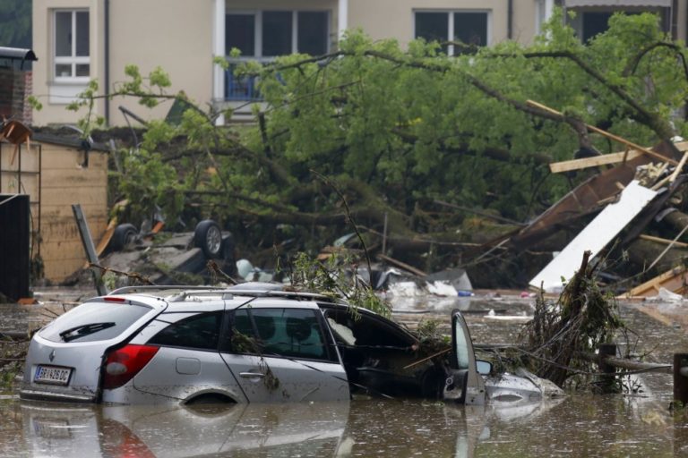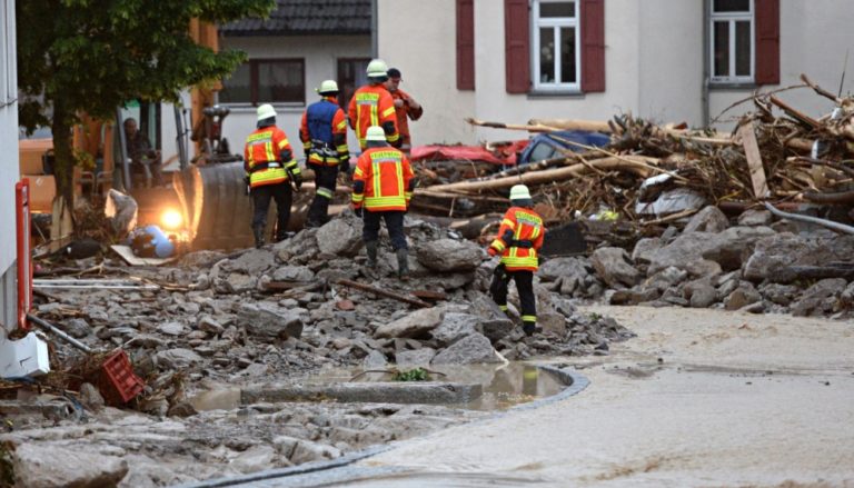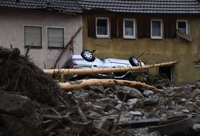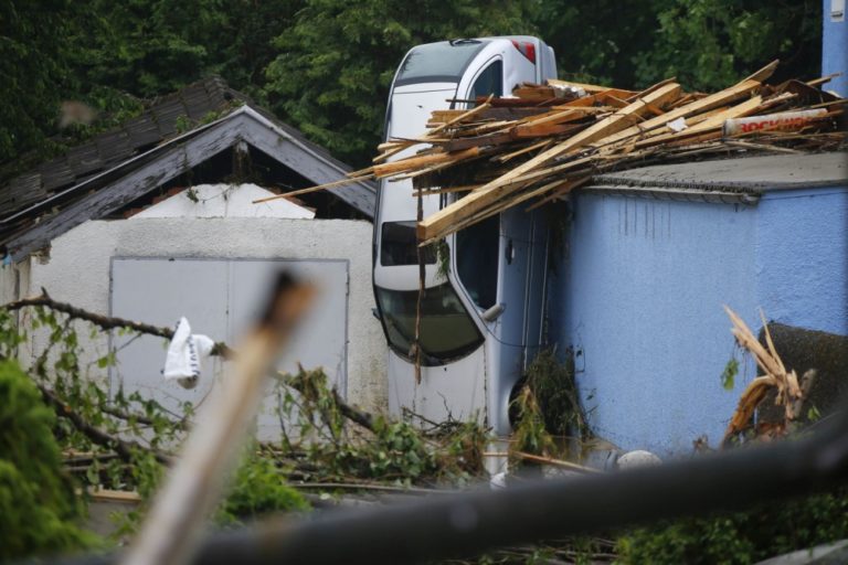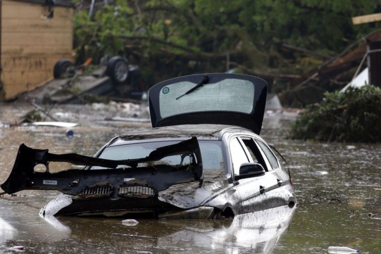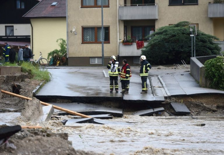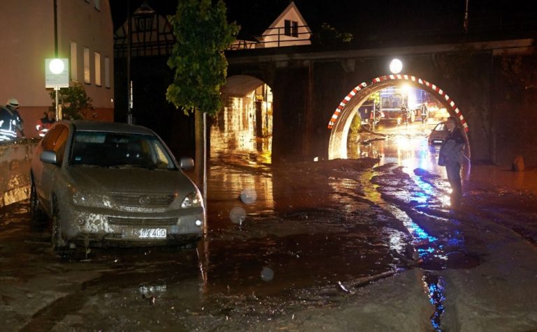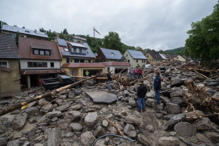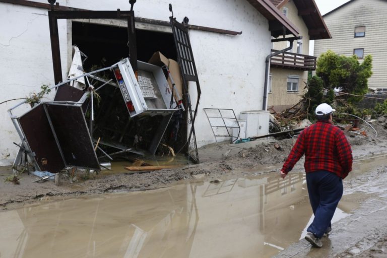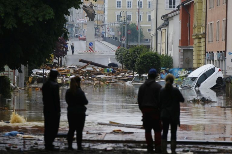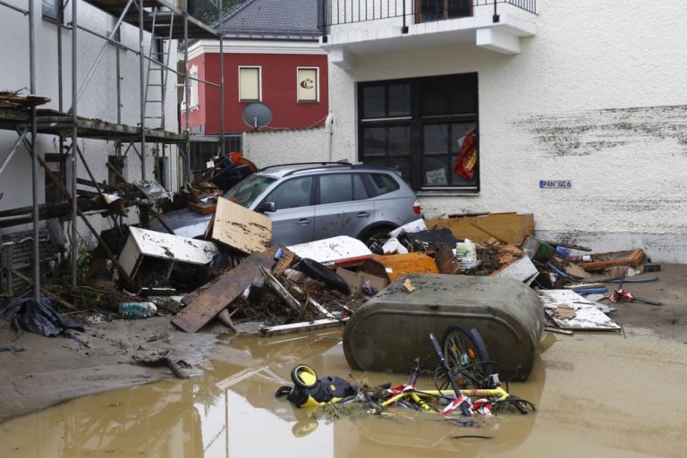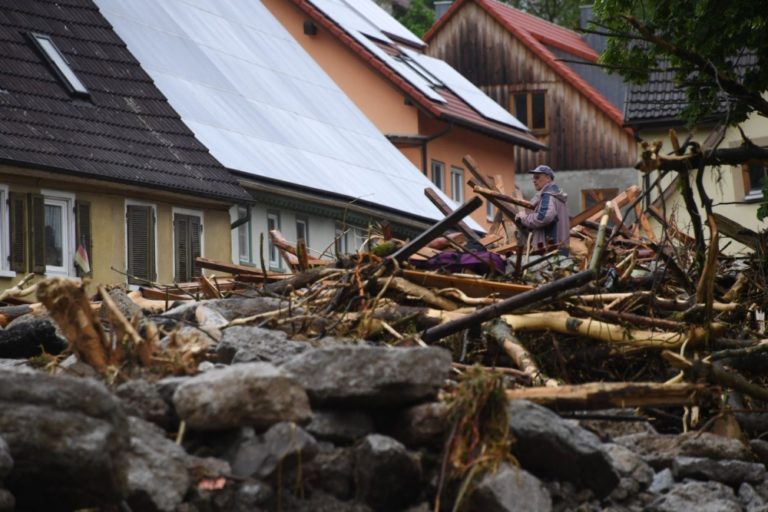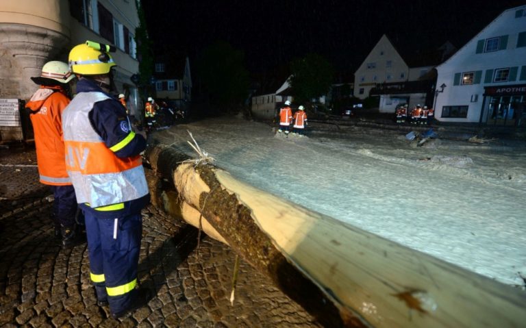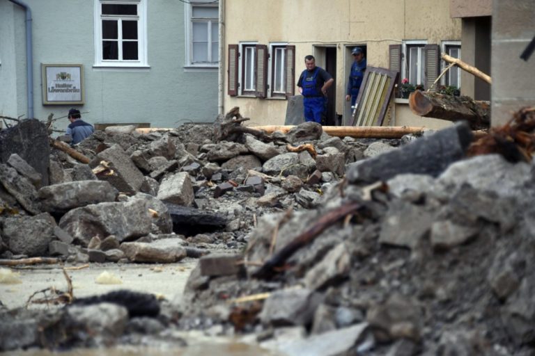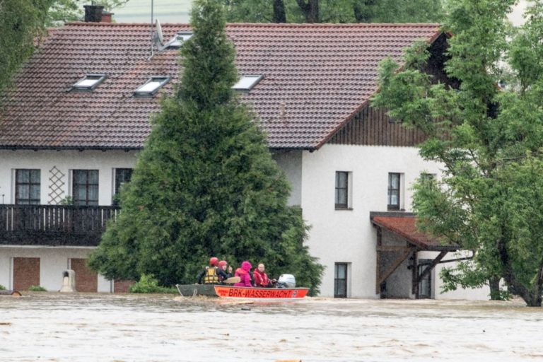 Ulice mnohých miest a obcí sú zaplavené až do výšky jedného metra. Cestu k viacerým domom voda celkom zahatala a ich obyvateľov museli zo striech zachraňovať vrtuľníkmi. Bavorské úrady odhadujú, že doposiaľ spôsobené škody by mohli presiahnuť až desať miliónov eur. Rozsah a rýchlosť povodní tam mnohých obyvateľov zaskočila; miestne úrady teraz varujú pred hroziacou katastrofou. Foto: Franziska Kraufmann/dpa via AP