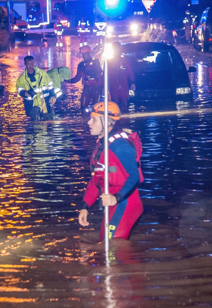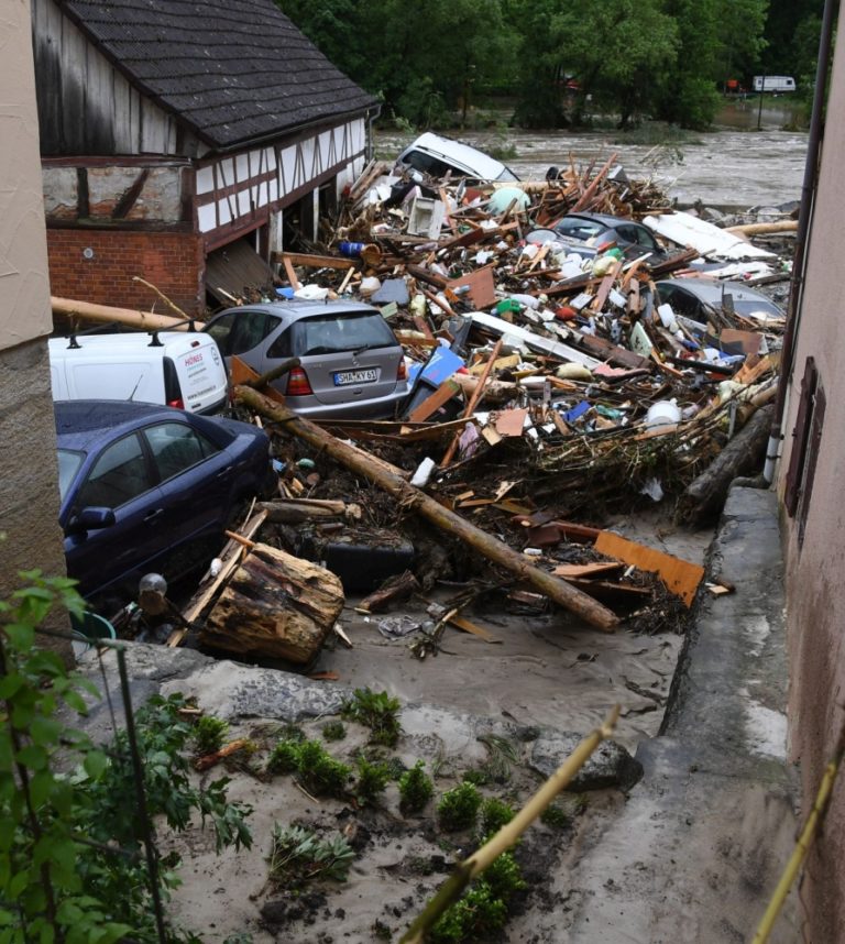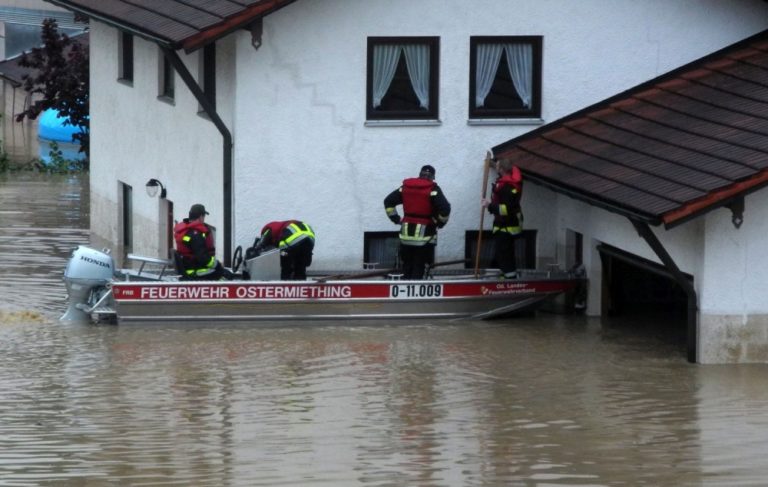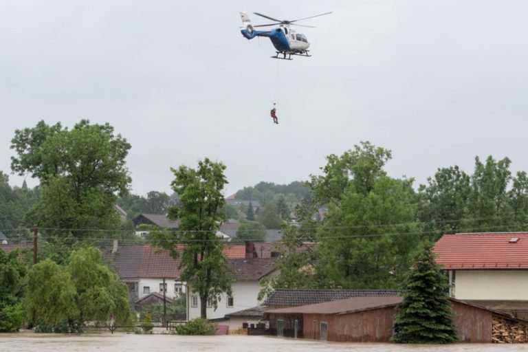 Ulice mnohých miest a obcí sú zaplavené až do výšky jedného metra. Cestu k viacerým domom voda celkom zahatala a ich obyvateľov museli zo striech zachraňovať vrtuľníkmi. Bavorské úrady odhadujú, že doposiaľ spôsobené škody by mohli presiahnuť až desať miliónov eur. Rozsah a rýchlosť povodní tam mnohých obyvateľov zaskočila; miestne úrady teraz varujú pred hroziacou katastrofou. Foto: Sven Hoppe/dpa via AP