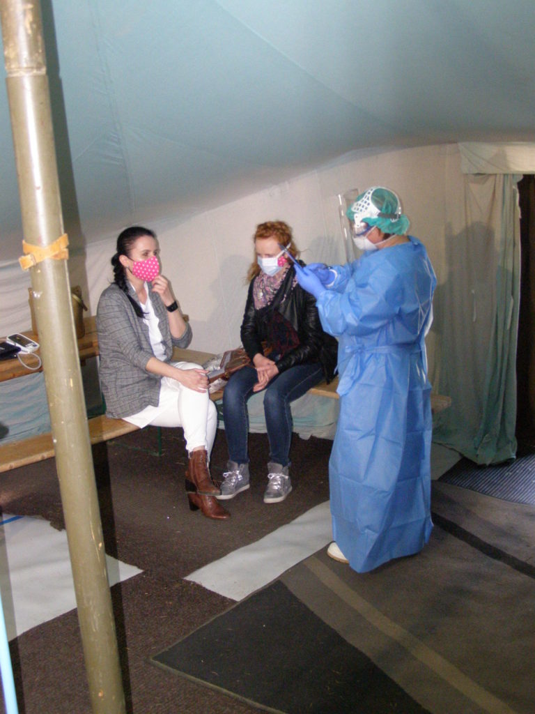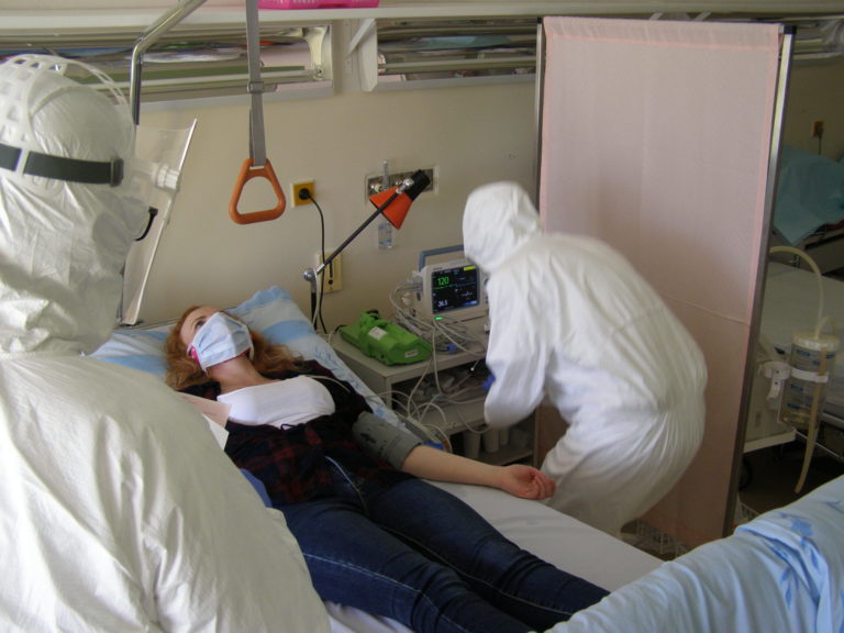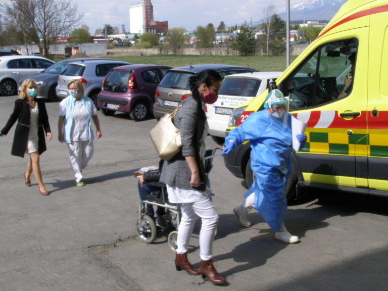 V Nemocnici Dr. Vojtecha Alexandra v Kežmarku si v utorok vyskúšali, ako by vyzeral príjem pacientky s podozrením na infarkt a s diagnózou COVID-19. 29. apríl 2020 Foto: Nemocnica Kežmarok