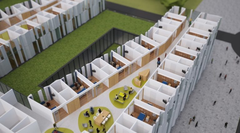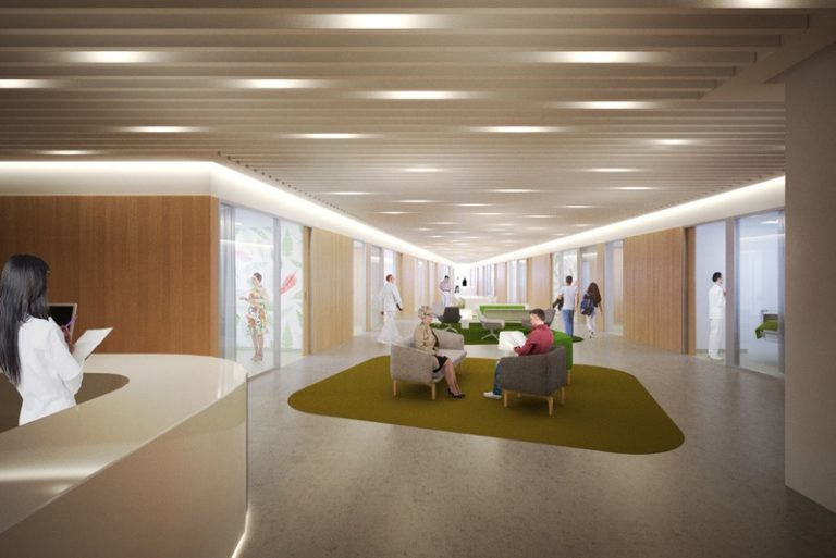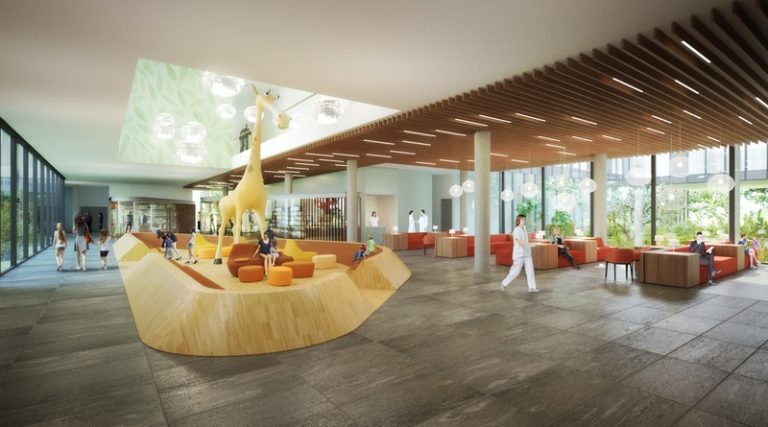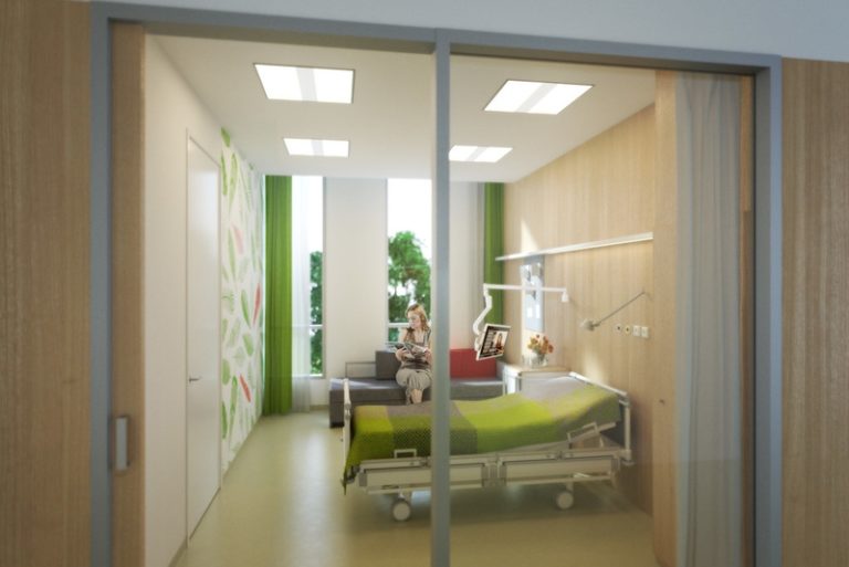 Grafické vizualizácie prvej koncovej nemocnice novej generácie, ktorú v Bratislave postaví spoločnosť Svet zdravia, a. s. Začiatok výstavby je naplánovaný na rok 2018, pričom prvých pacientov by mohla privítať už v prvej polovici roka 2021. Súkromná investícia by mala dosiahnuť viac ako 100 miliónov eur. Foto: Svet zdravia