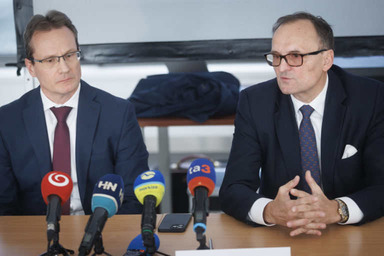 Zľava: Medicínsky riaditeľ Nemocnice Bory Róbert Hill a generálny riaditeľ Nemocnice Bory Ľuboš Lopatka počas tlačovej konferencie Nemocnice Bory v Bratislave na tému: Kolaudačné rozhodnutie, medicínske špecializácie, stavebný a personálny update, predstavenie zdravotníkov zo zahraničia a prvý deň otvorených dverí pre verejnosť. Bratislava, 25. november 2022. Foto: SITA/Branislav Bibel