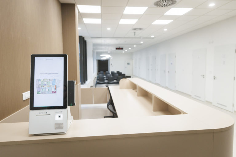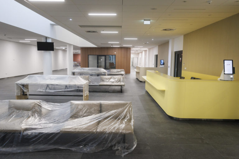 Recepcia pri vstupe do Nemocnice Bory v Bratislave počas prehliadky pri príležitosti tlačovej konferencie na tému: Kolaudačné rozhodnutie, medicínske špecializácie, stavebný a personálny update, predstavenie zdravotníkov zo zahraničia a prvý deň otvorených dverí pre verejnosť. Bratislava, 25. november 2022. Foto: SITA/Branislav Bibel