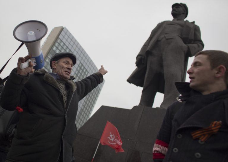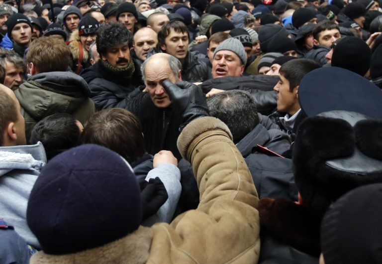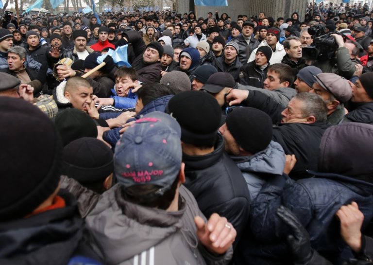 Odporcovia nového politického vedenia na Ukrajine v stredu protestovali pred parlamentom Krymskej republiky v Simferopoli (Aqmescite), kde sa dostali do potýčok s jeho podporovateľmi z radov miestnych Tatárov. Foto: SITA/AP