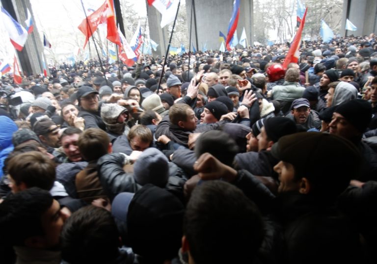 Odporcovia nového politického vedenia na Ukrajine v stredu protestovali pred parlamentom Krymskej republiky v Simferopoli (Aqmescite), kde sa dostali do potýčok s jeho podporovateľmi z radov miestnych Tatárov. Obsadili aj miestny parlament. Foto: SITA/AP