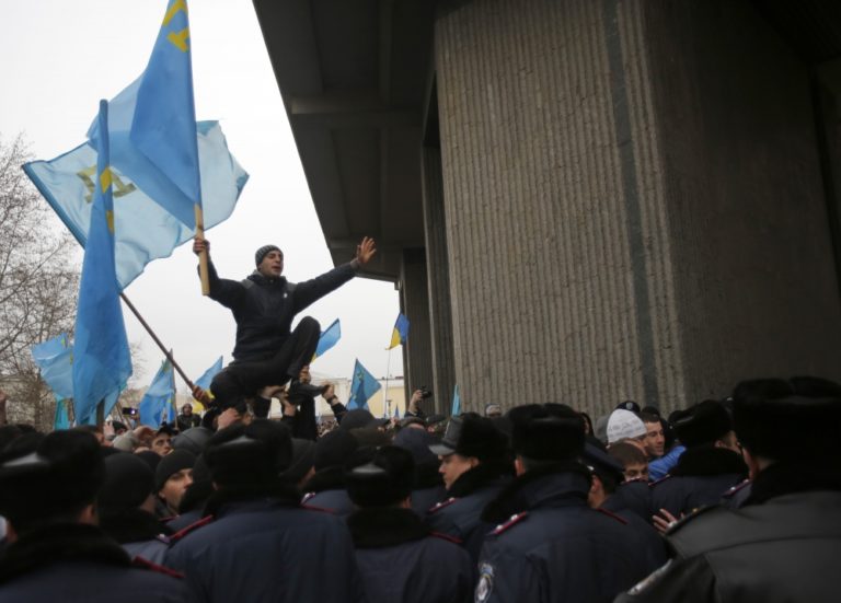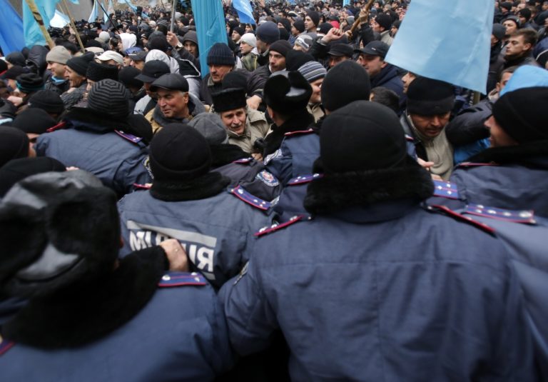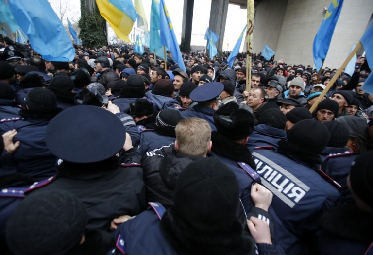 Odporcovia nového politického vedenia na Ukrajine v stredu protestovali pred parlamentom Krymskej republiky v Simferopoli (Aqmescite), kde sa dostali do potýčok s jeho podporovateľmi z radov miestnych Tatárov. Obsadili aj miestny parlament.