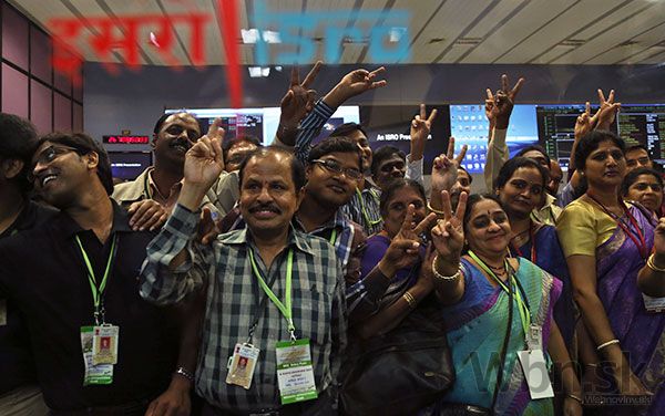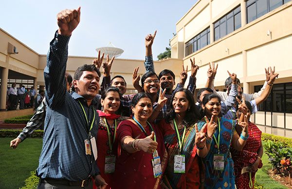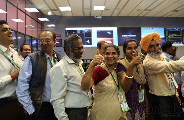 Indická robotická sonda Mangaljan v stredu úspešne vstúpila na obežnú dráhu Marsu. India sa tak stala štvrtou krajinou sveta, ktorej sa podarilo dostať až k červenej planéte a vôbec prvou krajinou, ktorej sa to podarilo na prvý pokus. Na fotografii: Vedci z indickej Organizácie pre výskum vesmíru sa tešia z úspechu. Foto: SITA/AP