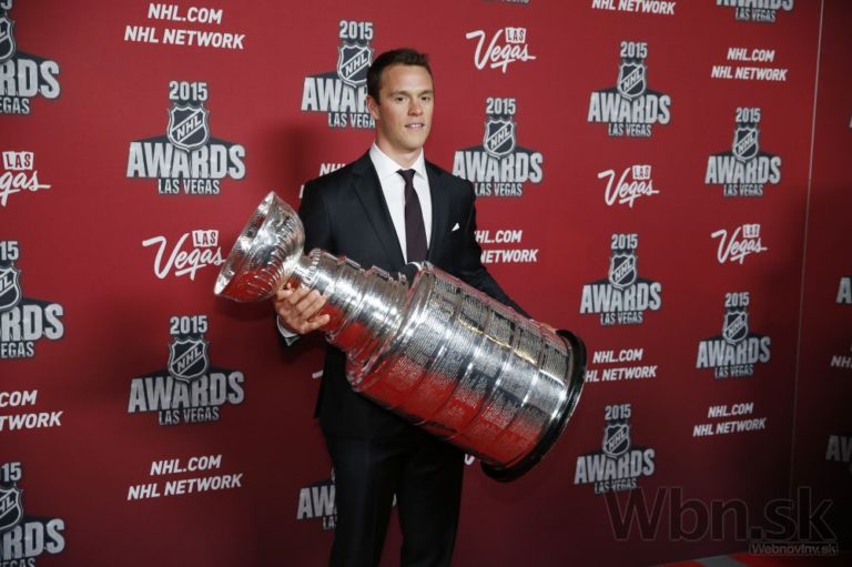 Jonathan Toews z tímu Chicago Blackhawks pózuje fotografom na červenom koberci počas udeľovania individuálnych ocenení NHL aj so Stanleyho pohárom v rukách. Las Vegas, 24. júna 2015. Foto: SITA/AP