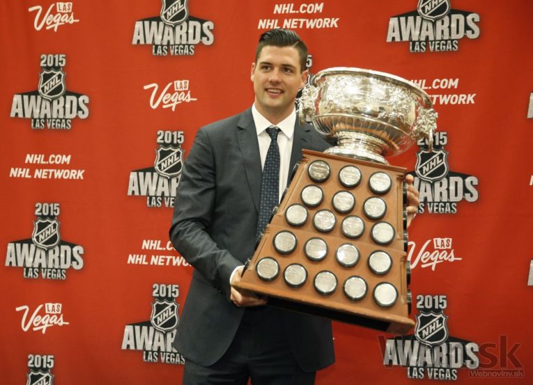 Carey Price z Montrealu pózuje so svojimi štyrmi trofejami, ktoré získal počas udeľovania individuálnych ocenení zámorskej NHL. Las Vegas, 24. júna 2015. Foto: SITA/AP