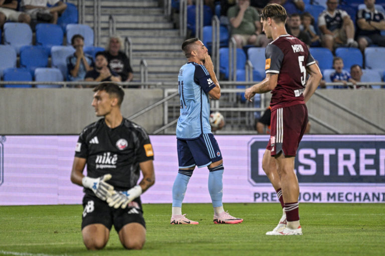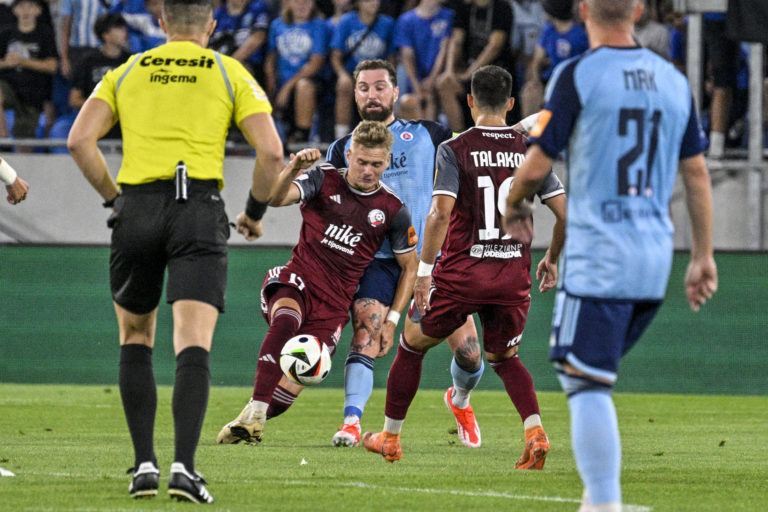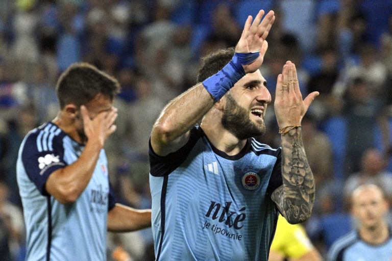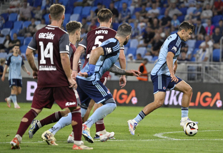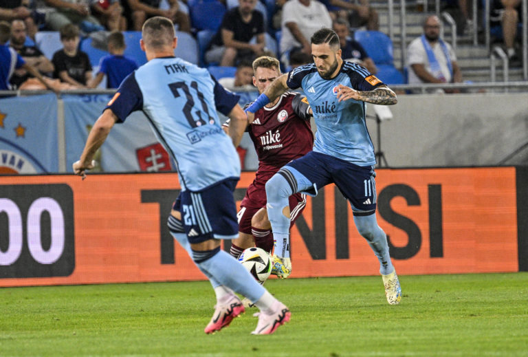 Kyriakos Savvidis z ŠK Slovan Bratislava (druhý sprava) počas futbalového zápasu 2. kola základnej časti Niké ligy 2024/2025 medzi ŠK Slovan Bratislava - FK Železiarne Podbrezová. Bratislava, 3. august 2024. Foto: SITA/Milan Illík.