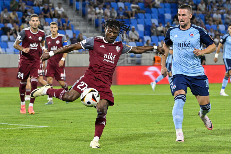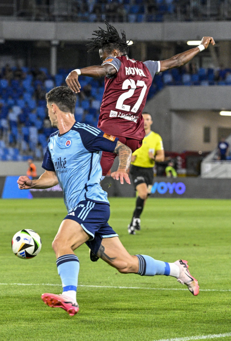 Zľava v popredí: Ridwan Sanusi z FK Železiarne Podbrezová a Róbert Mak z ŠK Slovan Bratislava počas futbalového zápasu 2. kola základnej časti Niké ligy 2024/2025 medzi ŠK Slovan Bratislava - FK Železiarne Podbrezová. Bratislava, 3. august 2024. Foto: SITA/Milan Illík.