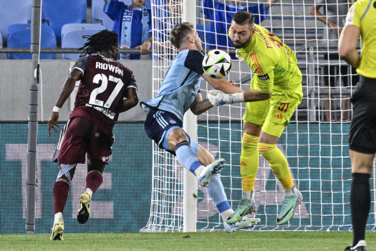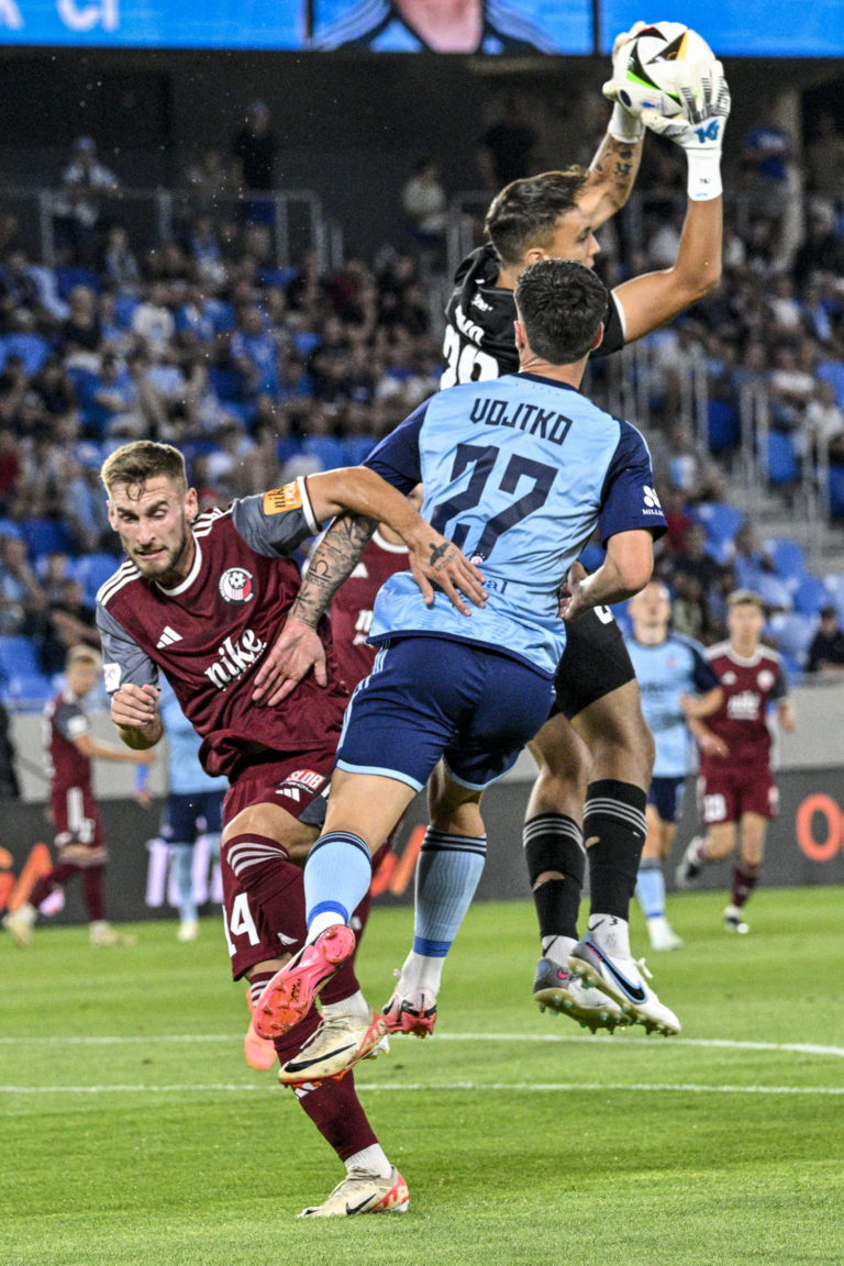 Sprava: Brankár Adam Danko z FK Železiarne Podbrezová a Marko Tolič z ŠK Slovan Bratislava počas futbalového zápasu 2. kola základnej časti Niké ligy 2024/2025 medzi ŠK Slovan Bratislava - FK Železiarne Podbrezová. Bratislava, 3. august 2024. Foto: SITA/Milan Illík.