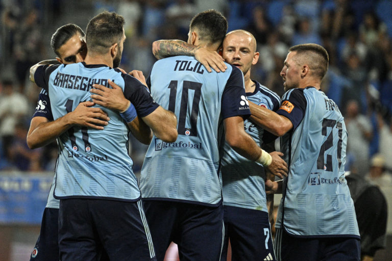 Hráči ŠK Slovan Bratislava sa tešia po góle 1-0 počas futbalového zápasu 2. kola základnej časti Niké ligy 2024/2025 medzi ŠK Slovan Bratislava - FK Železiarne Podbrezová. Bratislava, 3. august 2024. Foto: SITA/Milan Illík.