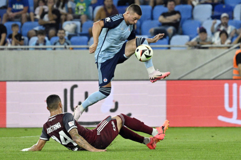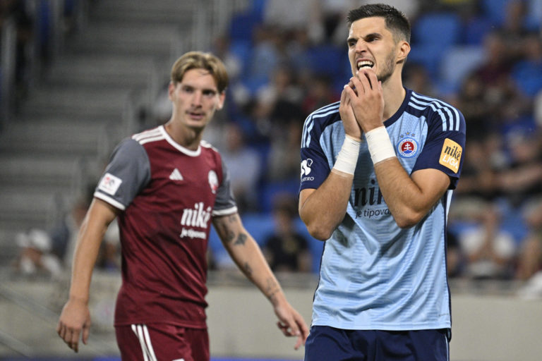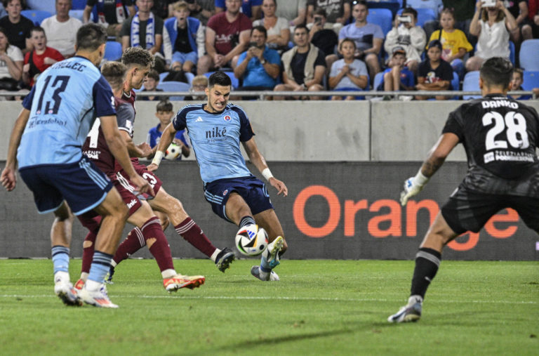 Marko Tolič z ŠK Slovan Bratislava (vpravo) počas futbalového zápasu 2. kola základnej časti Niké ligy 2024/2025 medzi ŠK Slovan Bratislava - FK Železiarne Podbrezová. Bratislava, 3. august 2024. Foto: SITA/Milan Illík.
