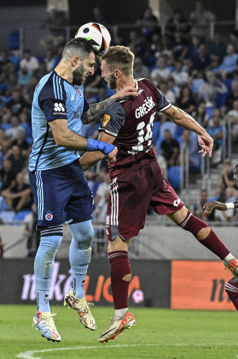 Sprava: Tigran Barsaghjan z ŠK Slovan Bratislava a Matej Grešák z FK Železiarne Podbrezová počas futbalového zápasu 2. kola základnej časti Niké ligy 2024/2025 medzi ŠK Slovan Bratislava - FK Železiarne Podbrezová. Bratislava, 3. august 2024. Foto: SITA/Milan Illík.