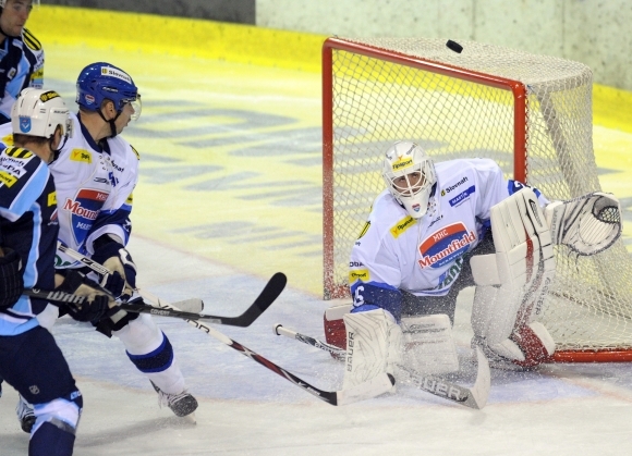 Brankár Martin Šúrek z MHC Mountfield Martin (vpravo) počas 5 . kola slovenskej hokejovej Tipsport extraligy 2013/2014 medzi HK Nitra - MHC Mountfield Martin. Foto: SITA/Martin Havran