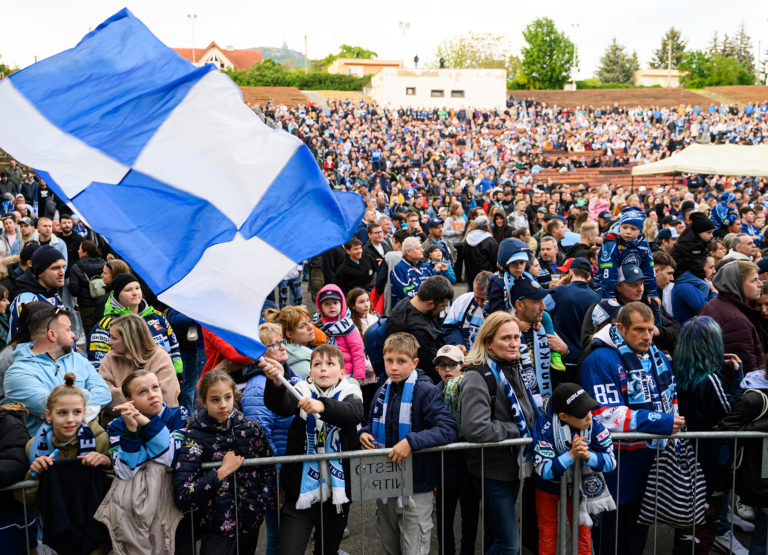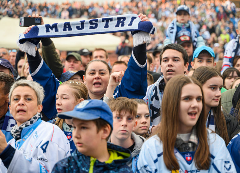 Fanúšikovia hokejového klubu HK Nitra počas osláv majstrovského titulu Tipos extraligy 2023/2024. Nitra, 26. apríl 2024. Foto: SITA/Martin Havran
