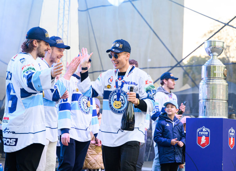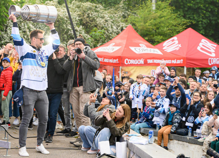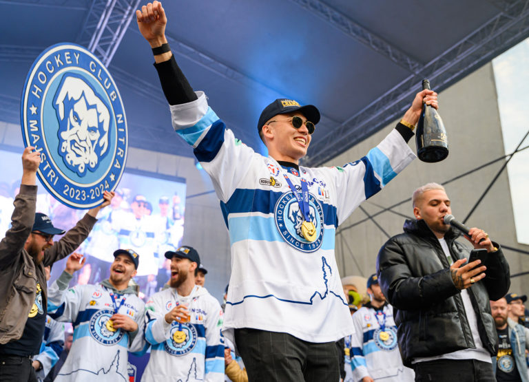 Jakub Lacka počas osláv majstrovského titulu Tipos extraligy 2023/2024. Nitra, 26. apríl 2024. Foto: SITA/Martin Havran