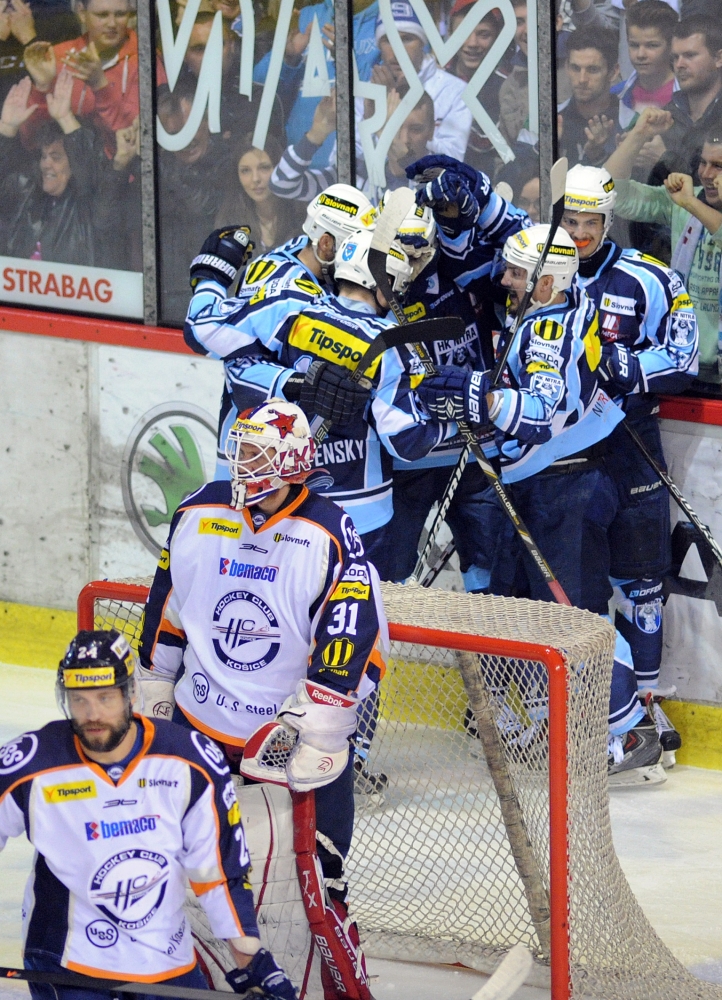 Radosť hráčov HK Nitra (hore) z úvodného gólu počas 6. zápasu finále slovenskej hokejovej Tipsport extraligy 2013/2014 medzi HK Nitra - HC Košice. Nitra, 19. apríl 2014. Foto: SITA/Martin Havran
