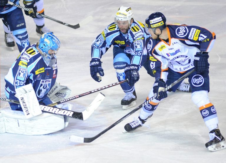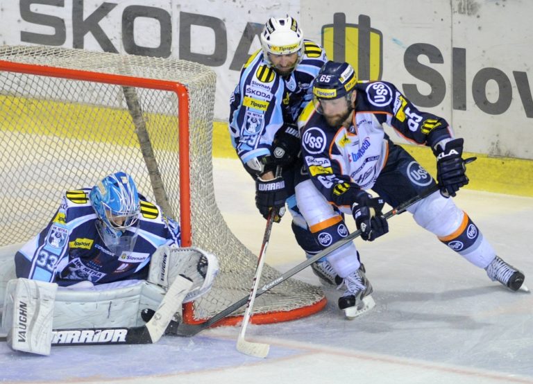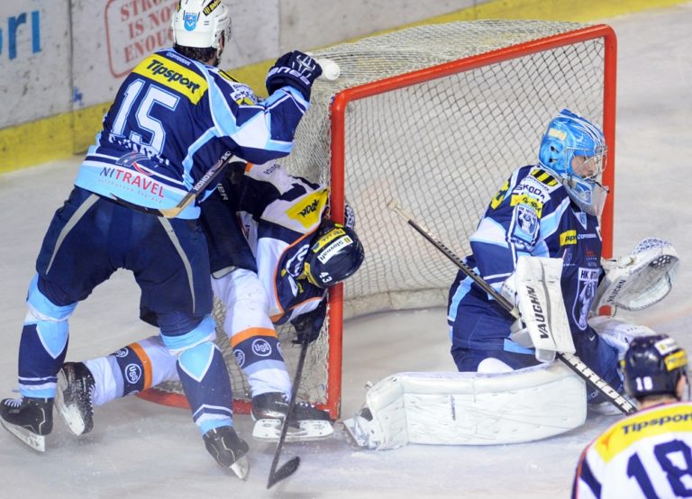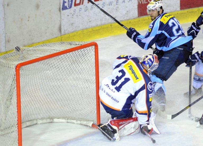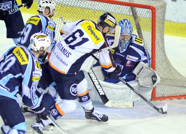 Brankár Robert Kristan z HK Nitra (vpravo) a Marek Bartánus z HC Košice (v strede) počas 6. zápasu finále slovenskej hokejovej Tipsport extraligy 2013/2014 medzi HK Nitra - HC Košice. Nitra, 19. apríl 2014. Foto: SITA/Martin Havran