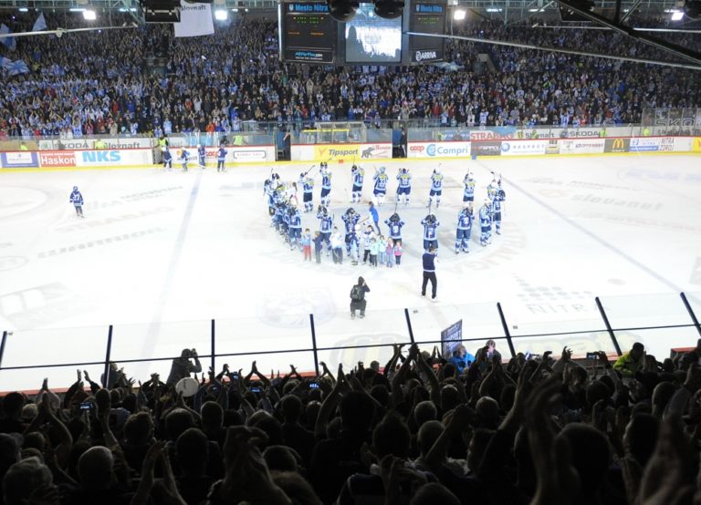 Hráči HK Nitra po skončení 6. zápasu finále slovenskej hokejovej Tipsport extraligy 2013/2014 medzi HK Nitra - HC Košice. Nitra, 19. apríl 2014. Foto: SITA/Martin Havran
