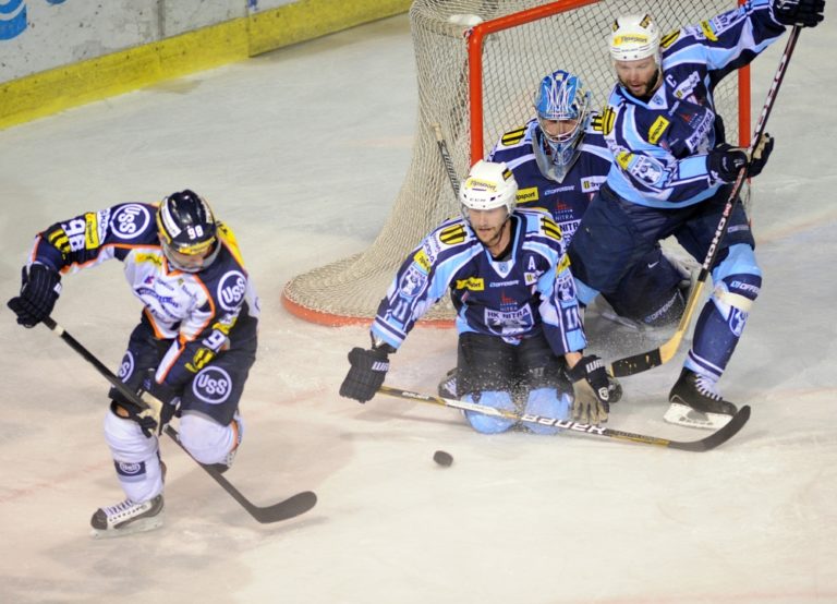 Brankár Rastislav Staňa z HC Košice (vľavo dole) inkasuje úvodný gól počas 6. zápasu finále slovenskej hokejovej Tipsport extraligy 2013/2014 medzi HK Nitra - HC Košice. Nitra, 19. apríl 2014. Foto: SITA/Martin Havran