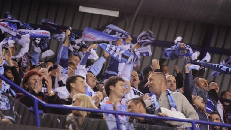 Fanúškovia Nitry počas druhého finálového zápasu hokejovej Tipsport extraligy medzi HC Košice - HK Nitra. Košice, 10. april 2014. Foto: SITA/Ivan Fleischer