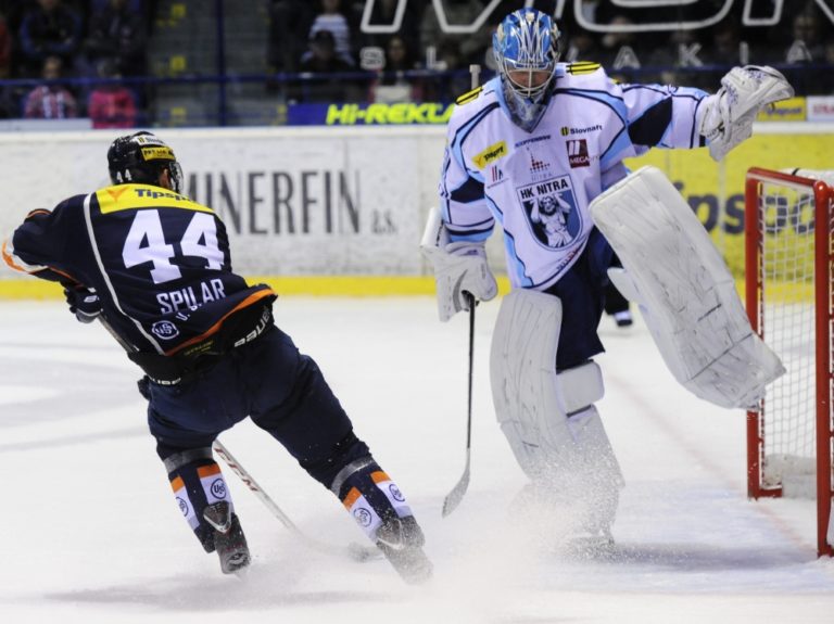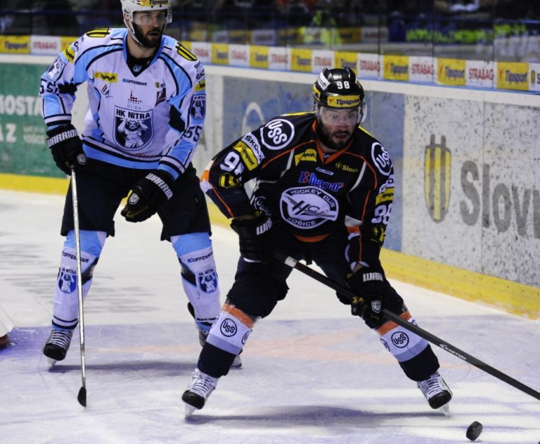 Zľava: Tomáš Nádaši z Nitry a Peter Bartoš z Košíc počas druhého finálového zápasu hokejovej Tipsport extraligy medzi HC Košice - HK Nitra. Košice, 10. april 2014. Foto: SITA/Ivan Fleischer