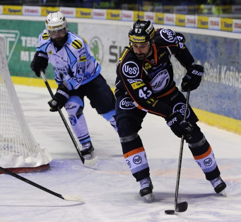 Zľava: Gabriel Spilar z Košíc a Robert Kristan z Nitry počas druhého finálového zápasu hokejovej Tipsport extraligy medzi HC Košice - HK Nitra. Košice, 10. april 2014. Foto: SITA/Ivan Fleischer
