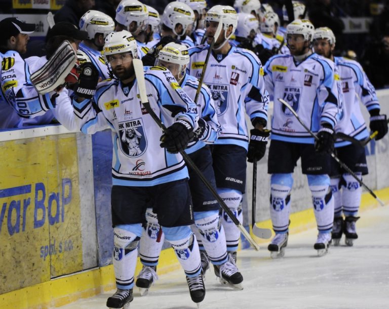 Hráči Nitry oslavujú gól v druhom finálovom zápase hokejovej Tipsport extraligy medzi HC Košice - HK Nitra. Košice, 10. april 2014. Foto: SITA/Ivan Fleischer