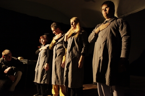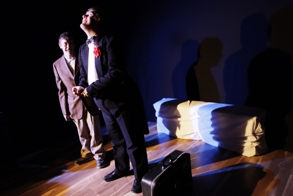 Herci Mestského divadla - Divadla z Pasáže pri ukážke z predstavenia Amerika podľa Kafku počas počas podujatia Noc divadiel. Foto: SITA/Ján Viazanička