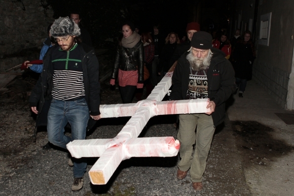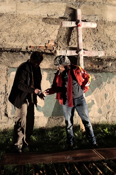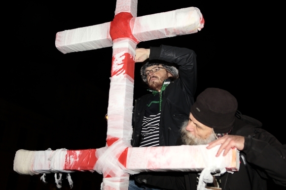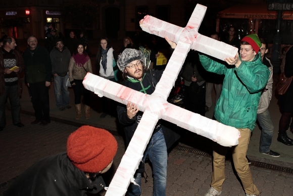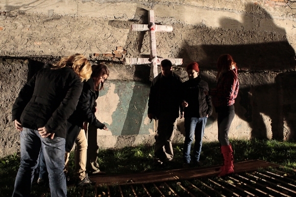 Divadelný happening Kľúče k demokracii spojený s inštaláciou interaktívnej sochy cyrilo-metodského dvojkríža v Záhrade- Centrum nezávislej kultúry počas podujatia Noc divadiel. Banská Bystrica, 17. november 2012. Foto: SITA/Ján Viazanička