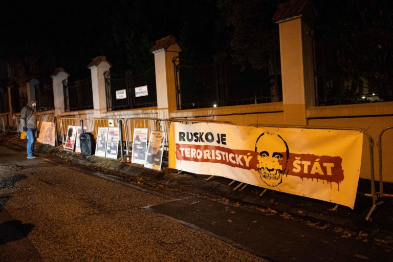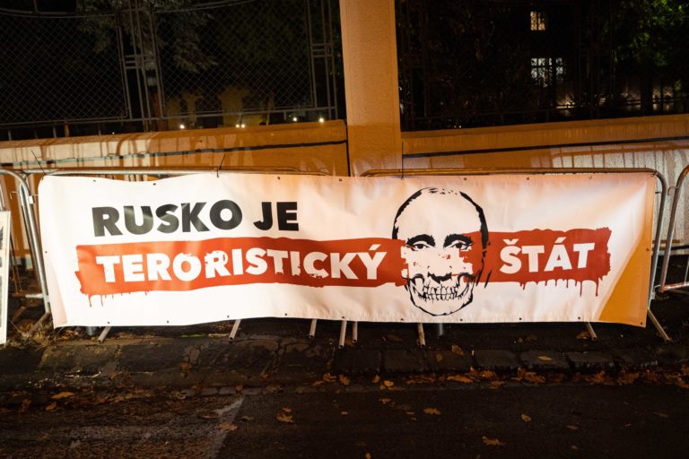 Transparent počas podujatia Noc s Ukrajinou, ktoré organizuje iniciatíva Mier Ukrajine pred budovou Veľvyslanectva Ruskej federácie v Bratislave. Bratislava, 24. november 2022. Foto: SITA/Jana Birošová