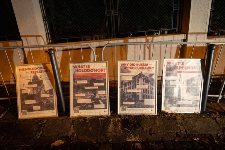 Plagáty počas podujatia Noc s Ukrajinou, ktoré organizuje iniciatíva Mier Ukrajine pred budovou Veľvyslanectva Ruskej federácie v Bratislave. Bratislava, 24. november 2022. Foto: SITA/Jana Birošová