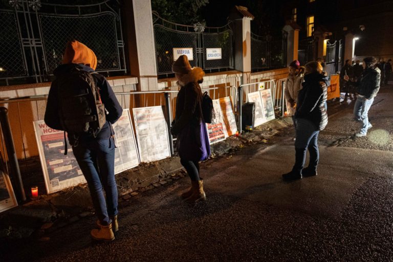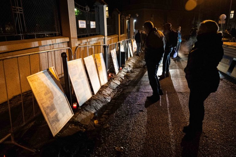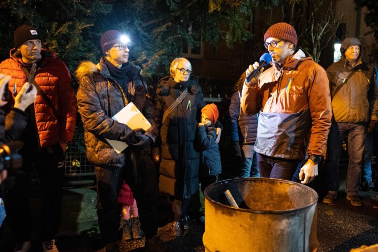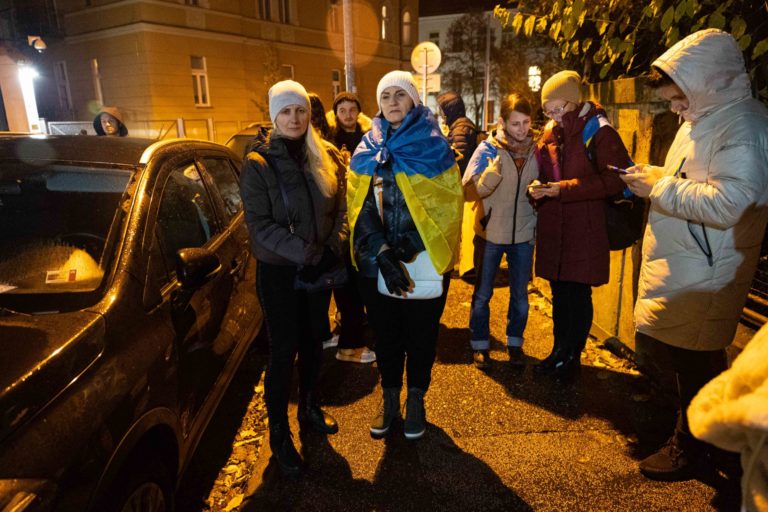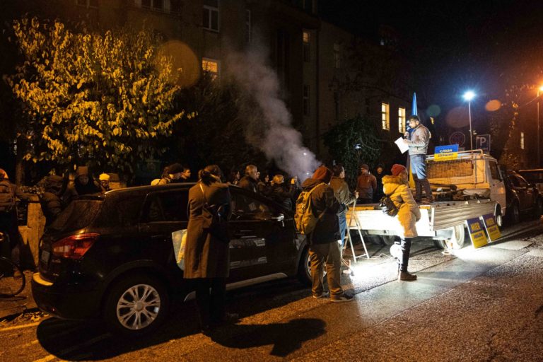 Atmosféra počas podujatia Noc s Ukrajinou, ktoré organizuje iniciatíva Mier Ukrajine pred budovou Veľvyslanectva Ruskej federácie v Bratislave. Bratislava, 24. november 2022. Foto: SITA/Jana Birošová