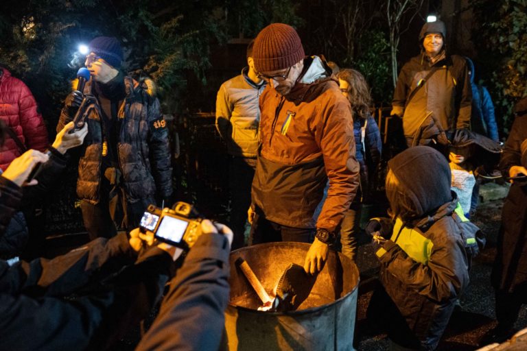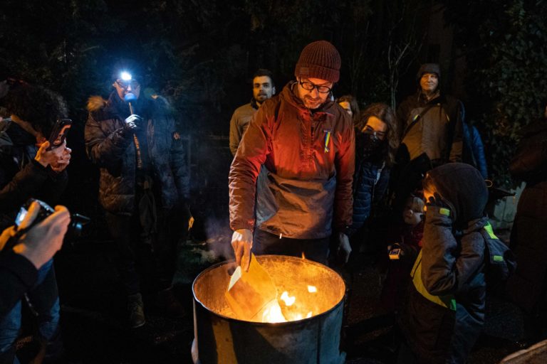Zapálenie ohňa počas podujatia Noc s Ukrajinou, ktoré organizuje iniciatíva Mier Ukrajine pred budovou ruskej ambasády. Bratislava, 24. november 2022. Foto: SITA/Jana Birošová