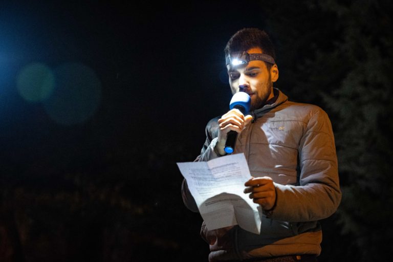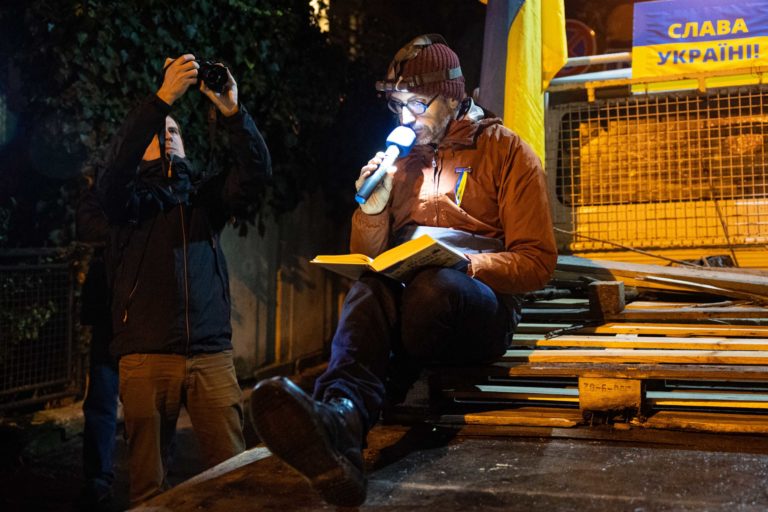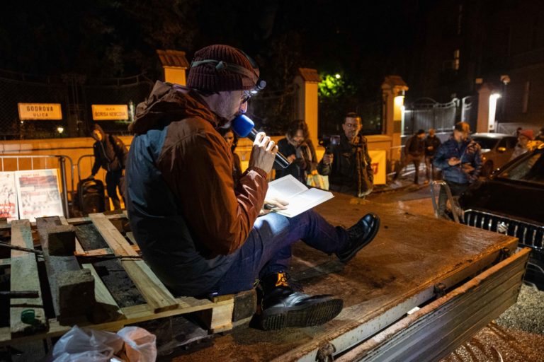 Čítanie poviedky počas podujatia Noc s Ukrajinou, ktoré organizuje iniciatíva Mier Ukrajine pred budovou Veľvyslanectva Ruskej federácie v Bratislave. Bratislava, 24. november 2022. Foto: SITA/Jana Birošová