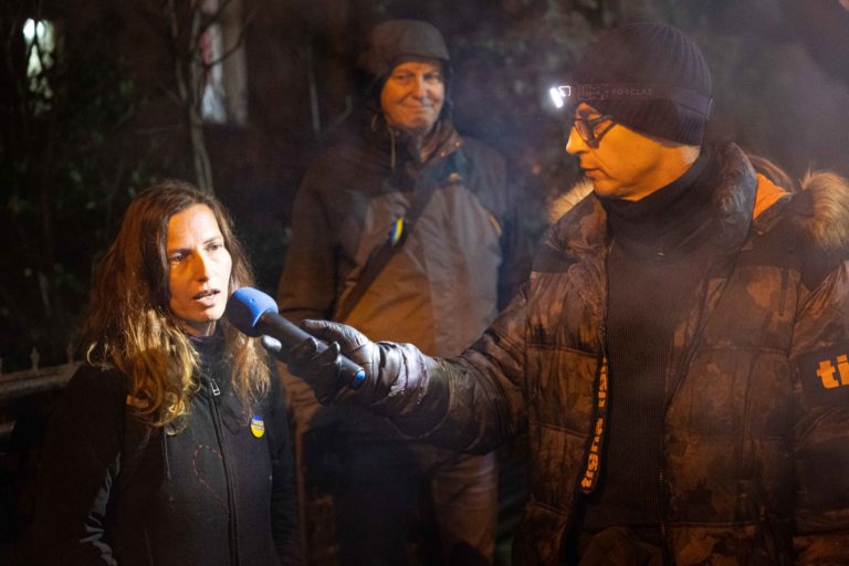 Lucia Rosáková (vľavo) z iniciatívy Mier Ukrajine počas podujatia Noc s Ukrajinou, ktoré organizuje iniciatíva Mier Ukrajine pred budovou Veľvyslanectva Ruskej federácie v Bratislave. Bratislava, 24. november 2022. Foto: SITA/Jana Birošová