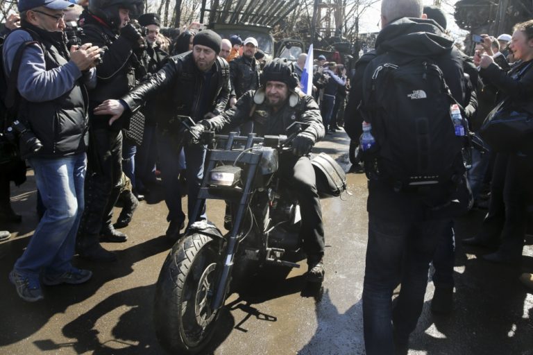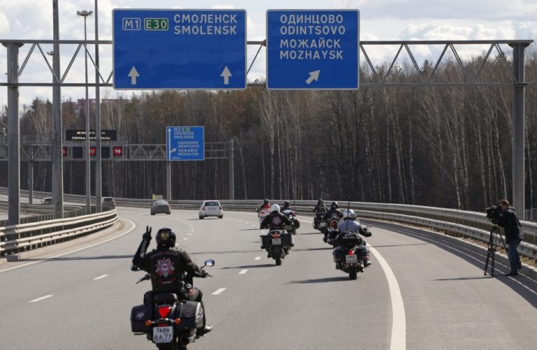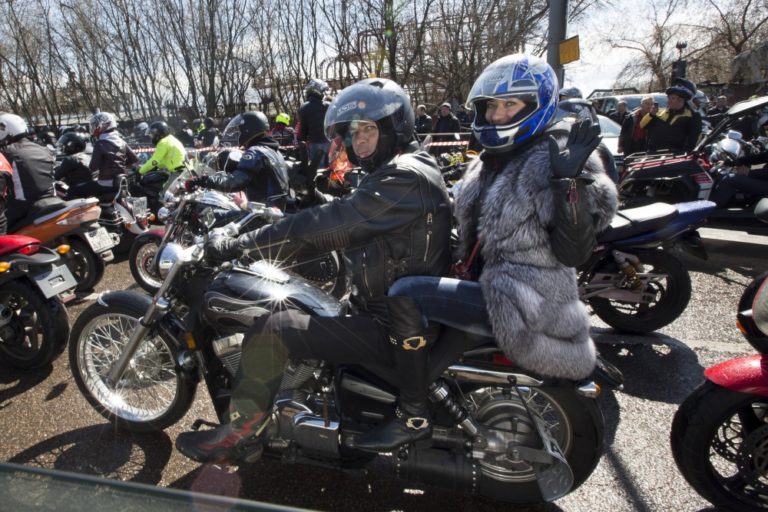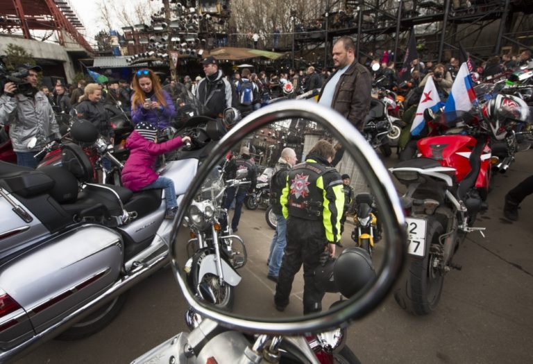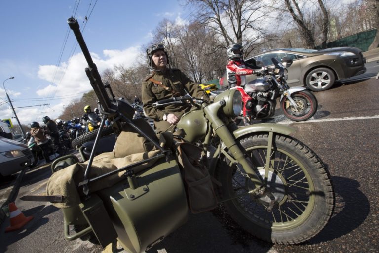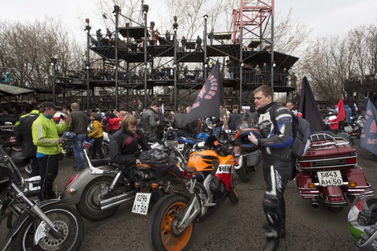 Ruskí motorkári Noční vlci odštartovali v sobotu z Moskvy jazdu na počesť 70. výročia skončenia druhej svetovej vojny v Európe, ktorá bude symbolicky kopírovať postup Červenej armády pri oslobodzovaní krajín spod nadvlády nemeckých nacistov. Foto: SITA/AP